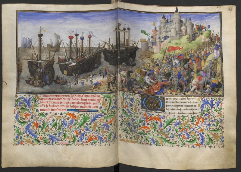 Vienna, Österreichische Nationalbibliothek, 2617, ff. 18v-19r. L'illustrazione di estende su due carte, e rappresenta lo sbarco dell'esercito greco guidato da Teseo e la battaglia …