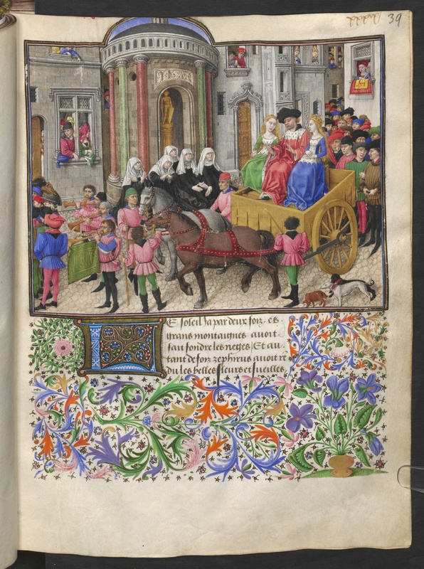 Vienna, Österreichische Nationalbibliothek, 2617, f. 39r. Teseo attraversa la città di Atene sul carro trionfale, avendo al suo fianco la regina delle Amazzoni Ippolita ed Emilia; …