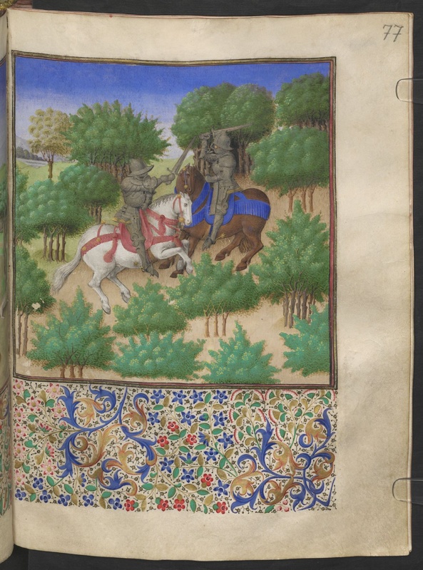 Vienna, Österreichische Nationalbibliothek, 2617, f. 77r. Arcita e Palemone si sfidano a duello nel bosco per conquistare la mano di Emilia, osservati dalla fanciulla; l'illustrazi…
