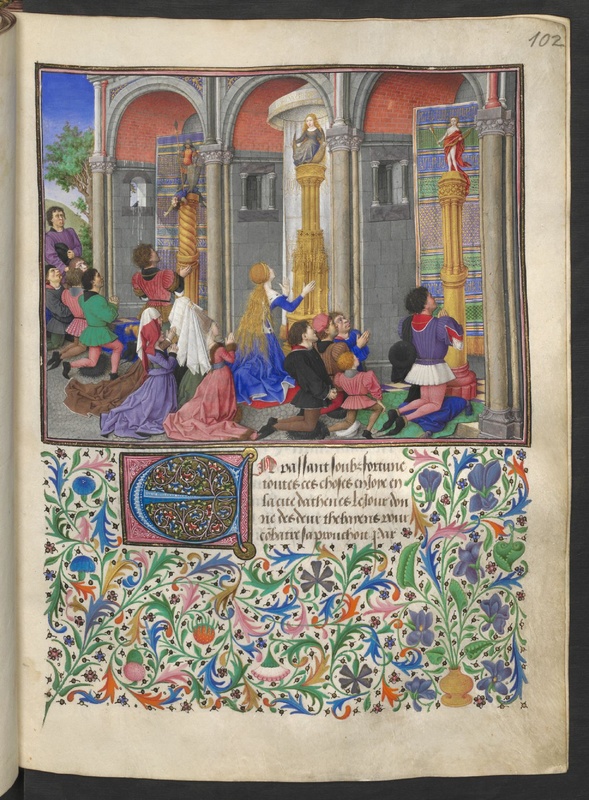 Vienna, Österreichische Nationalbibliothek, 2617, f. 102r. Emilia, Arcita e Palemone, insieme ad altri personaggi, invocano l'aiuto e la protezione dei propri dei.