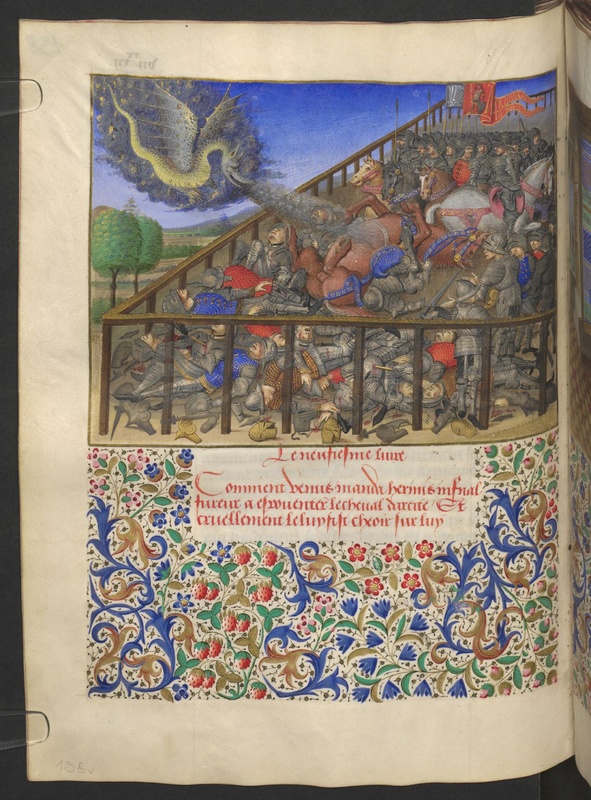 Vienna, Österreichische Nationalbibliothek, 2617, f. 138v. Arcita viene disarcionato dalla Furia Erinis, rappresentata come un drago alato.