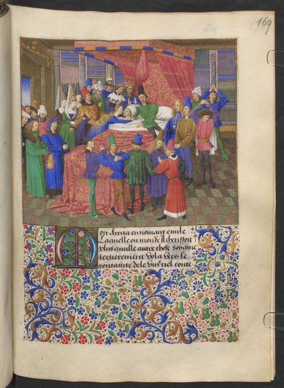 Vienna, Österreichische Nationalbibliothek, 2617, f. 139r. Emilia sposa Arcita al suo capezzale, quando questi è in punto di morte.