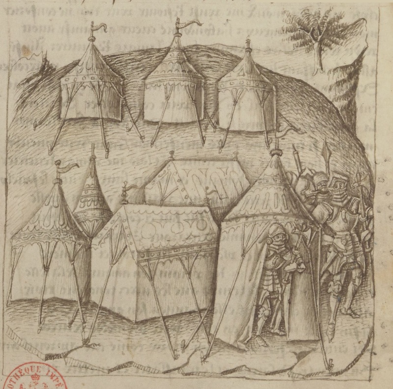 Parigi, Bibliothèque Nationale de France, Fr. 25528, f. 2v. Il copista del manoscritto è Pierre d'Amboise. Alcuni soldati escono dalle tende dell'accampamento greco fuori le mura d…
