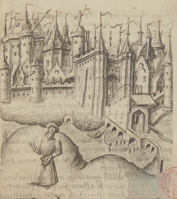 Parigi, Bibliothèque Nationale de France, Fr. 25528, f. 19v. Il copista del manoscritto è Pierre d'Amboise. Criseide osserva Troiolo passare a cavallo sotto la sua finestra insieme…