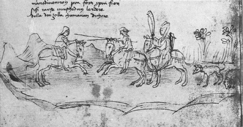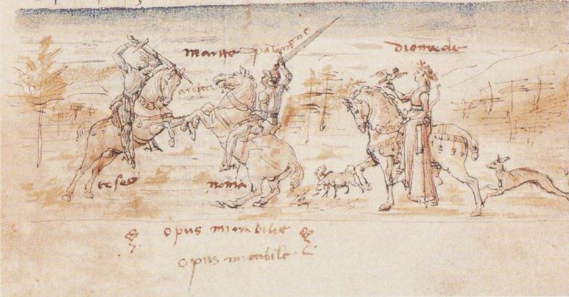 Firenze, Biblioteca Nazionale Centrale, II.II.27, f. 51r. Arcita e Palemone si sfidano a duello, osservati da Emilia vestita da cacciatrice.