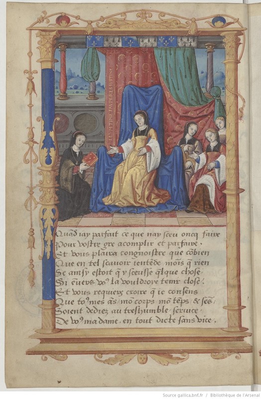 Parigi, Bibliothèque de l'Arsenal, 5116, f. 1v. Anne Malet de Graville presenta il suo libro alla regina Claudia di Francia, circondata dalle dame della sua corte.
