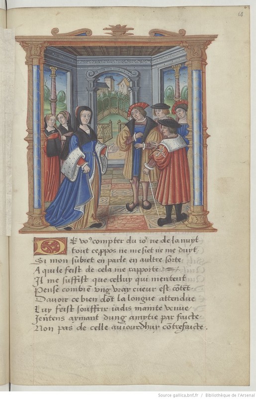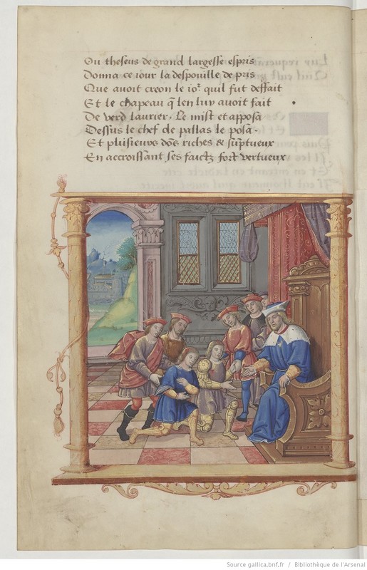 Parigi, Bibliothèque de l'Arsenal, 5116, f. 68r. Teseo acconsente alle nozze tra Emilia e Palemone.