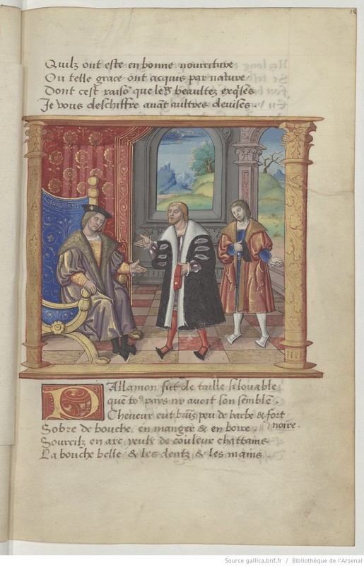Parigi, Bibliothèque de l'Arsenal, 5116, f. 2r. Ippolita ed Emilia si trovano dinanzi a Teseo assiso in trono, mentre un cavaliere si allontana dalla scena.