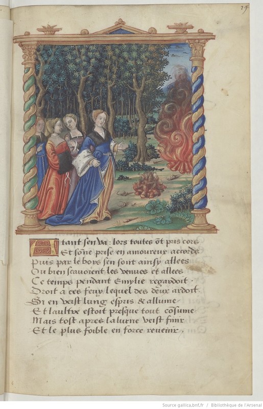 Parigi, Bibliothèque de l'Arsenal, 5116, f. 29r. Emilia, accompagnata da alcune donne, offre un sacrificio alla dea Diana per conoscere il nome del vincitore del duello.