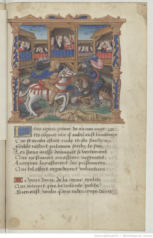 Parigi, Bibliothèque de l'Arsenal, 5116, f. 36r. Davanti alla corte si svolge il duello tra Arcita e Palemone.
