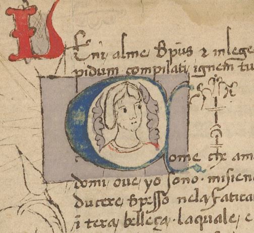 Madrid, Biblioteca Nacional de España, MSS/10271, f. 2v. Piccola testa di profilo di un giovane uomo (Teseo?), all'interno dell'iniziale a bianchi girari e figurata O (sorelle).