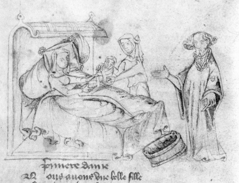Parigi, Bibliothèque Nationale de France, Fr. 2203, f. 28v. Il manoscritto è datato 1395. Griselda dà alla luce una figlia, assistita da una fantesca.