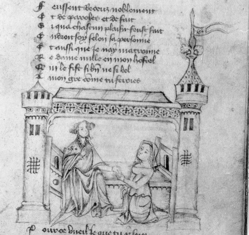 Parigi, Bibliothèque Nationale de France, Fr. 2203, f. 17v. Il manoscritto è datato 1395. Gualtieri convoca Giannucole al castello per comunicargli la sua intenzione di sposare Gri…