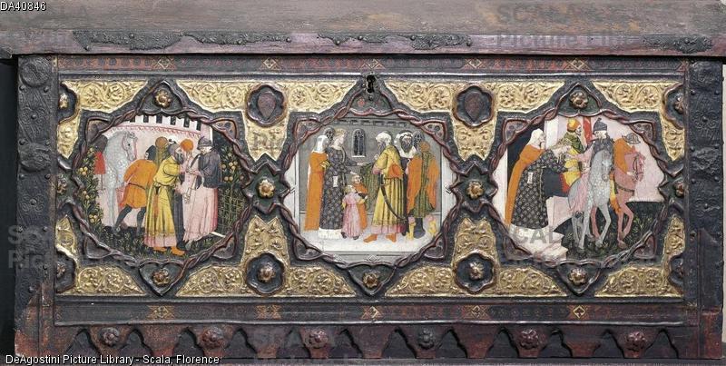 Firenze, Museo Nazionale del Bargello, Mobili n. 160. Messer Torello accoglie nella città di Pavia il Saladino travestito da mercante; accompagnata dai figli, Adalieta, moglie di T…