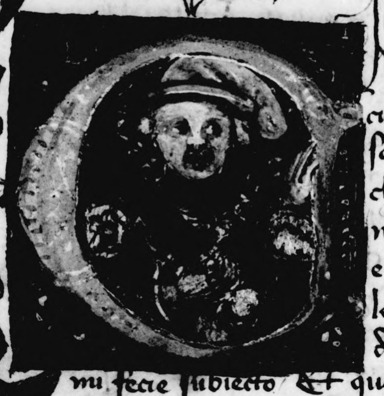 Parigi, Bibliothèque Nationale de France, Fr. 2203, f. 42v. Il manoscritto è datato 1395. Testa di un personaggio maschile (Boccaccio?), all'interno dell'iniziale figurata C(hevali…