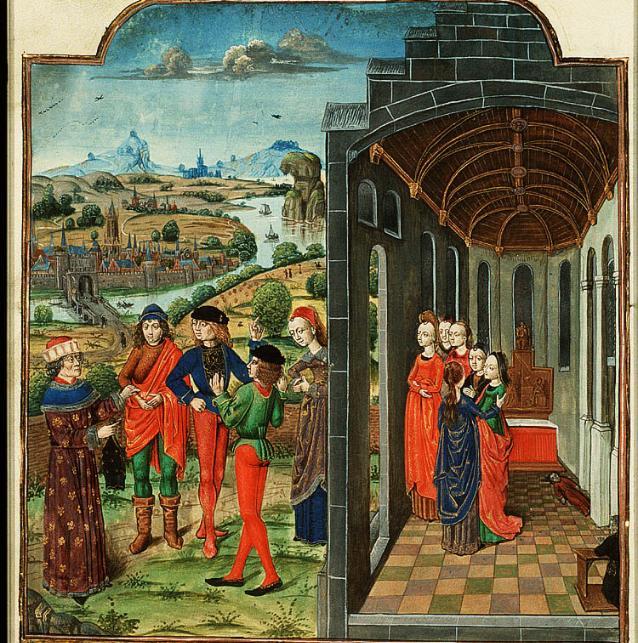 Maestro del 1482 (1485 c.), Neifile invita Filostrato a raccontare la prima novella della giornata; sullo sfondo, tre monache all'ingresso di un convento