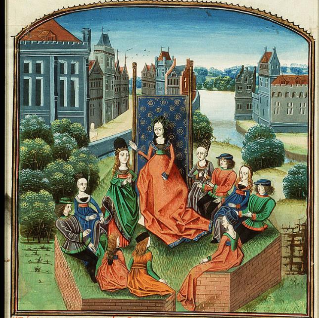 L'Aia, Koninklijke Bibliotheek, 133 A 5, f. 47v. I dieci novellatori sono riuniti nel giardino intorno a Filomena, regina della seconda giornata.
