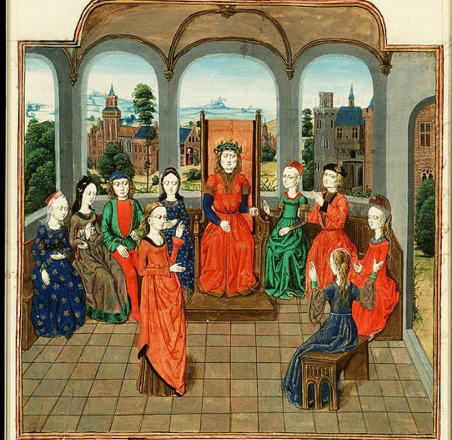 Miniatore veneto (1450 c.), Pampinea, incoronata regina, siede circondata dagli altri novellatori