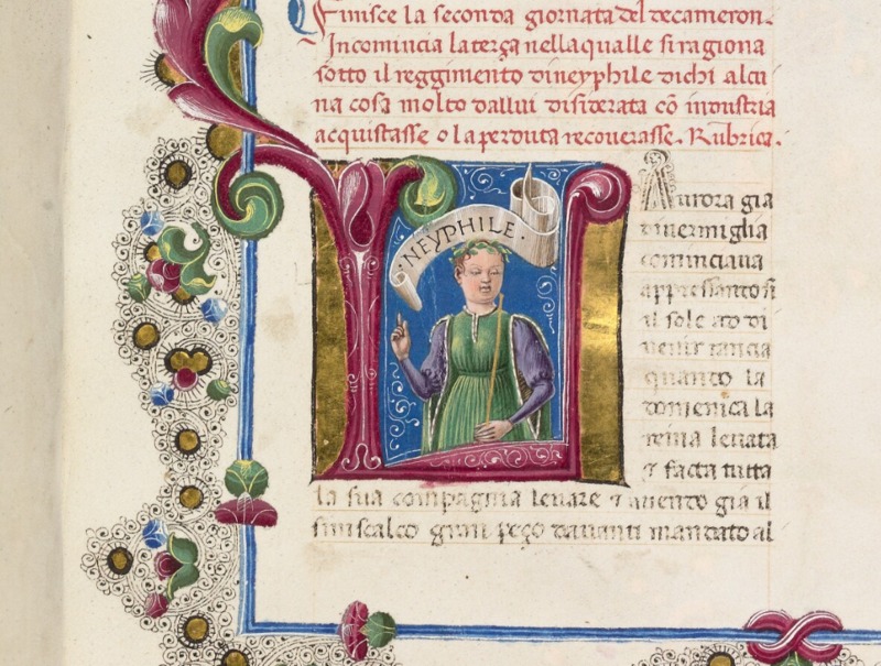 Oxford, Bodleian Library, Holkham misc. 49, f. 137v. Busto di Emilia, regina della nona giornata, all'interno dell'iniziale figurata L(a luce).