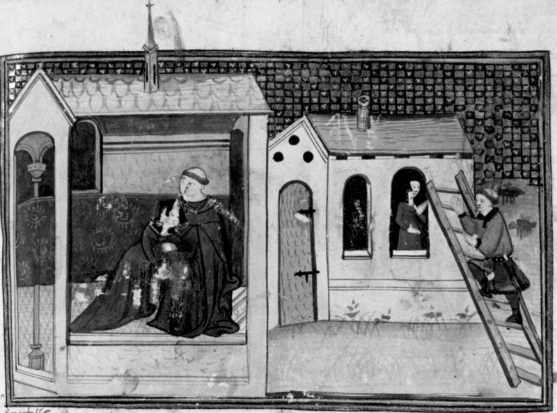 Parigi, Bibliothèque Nationale de France, Fr. 12421, f. 121r. Una donna si confessa in chiesa con un prete; la donna riceve la visita del suo innamorato, che si introduce nella cas…