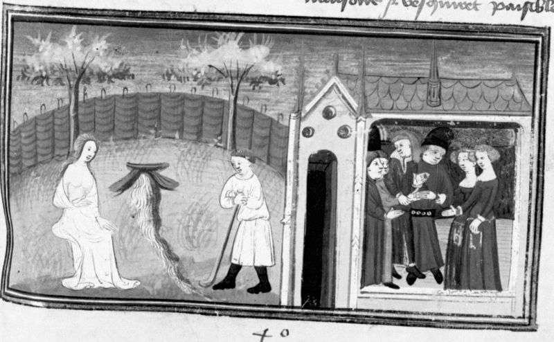 Parigi, Bibliothèque Nationale de France, Fr. 12421, f. 159r. Alibech si trova con l'eremita Rustico; la fanciulla si unisce in matrimonio con Neerbale.