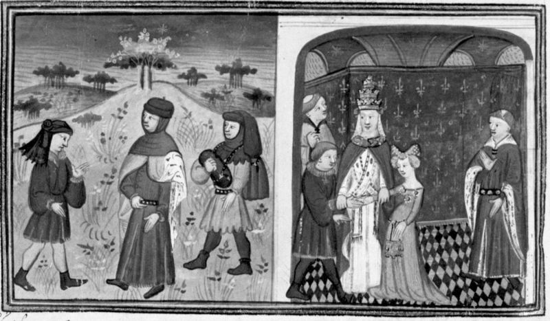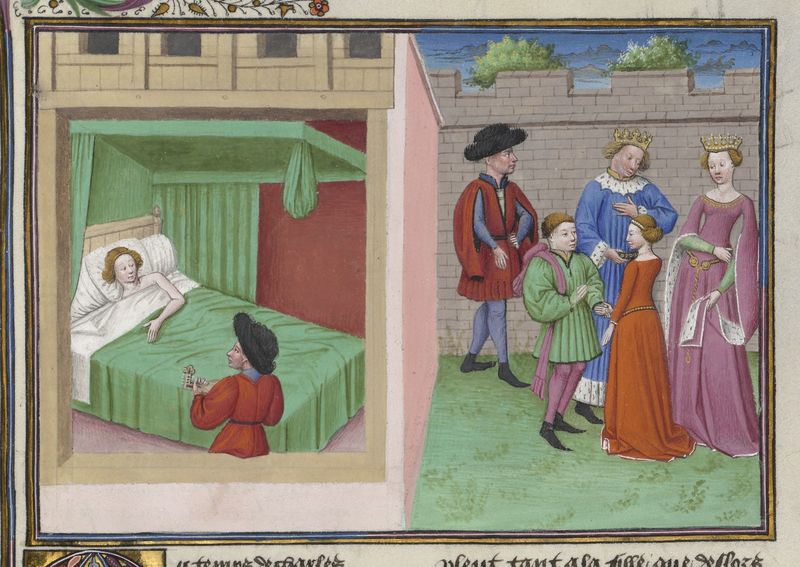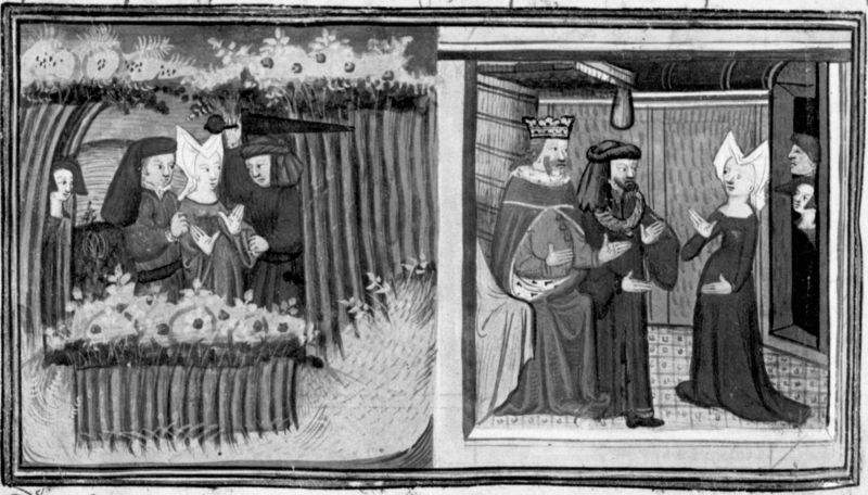 Maestro di Jean Mansel (1430-1450), Lisa parla con il cantore Minuccio; il re fa sposare la fanciulla