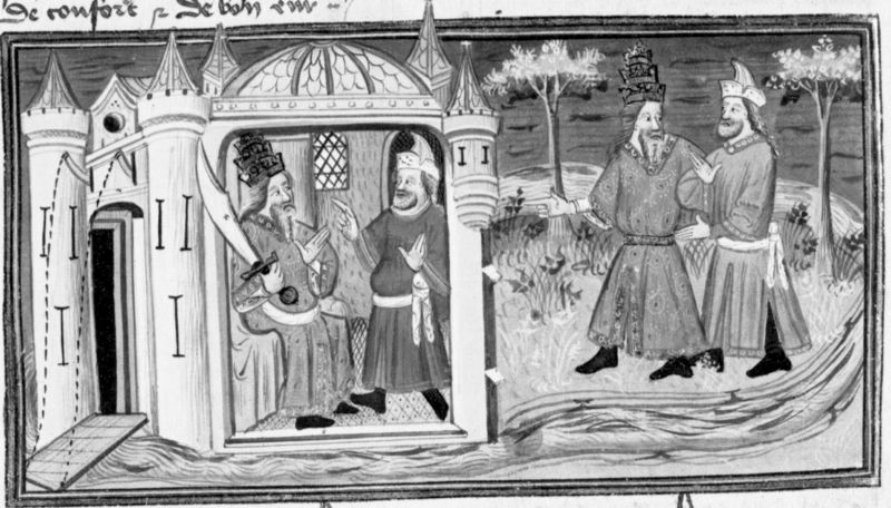 Parigi, Bibliothèque Nationale de France, Fr. 12421, f. 23v. Al cospetto del Saladino, Melchisedech racconta la parabola dei tre anelli; i due uomini, divenuti amici, attraversano …