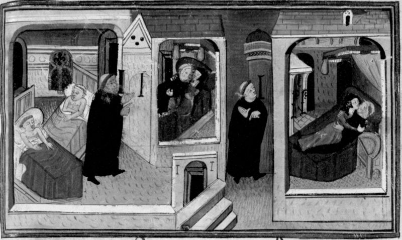 Miniatore francese (1425-1450), Paganino rapisce la moglie di Ricciardo; Paganino giace con Bartolomea; Ricciardo a colloquio con la moglie