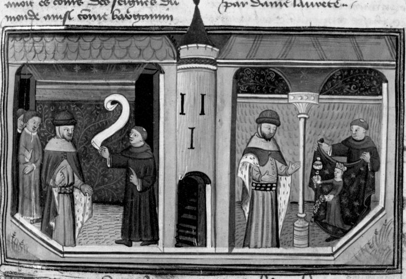 Parigi, Bibliothèque Nationale de France, Fr. 12421, f. 31r. Un uomo viene interrogato da un frate inquisitore; l'inquisitore riceve di nascosto del denaro.