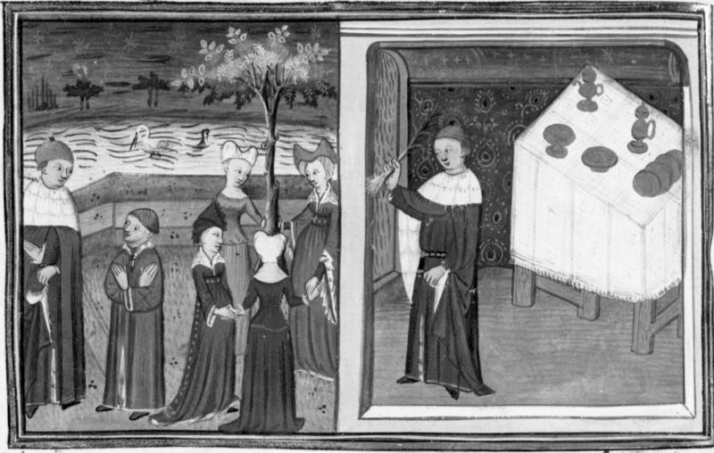 Parigi, Bibliothèque Nationale de France, Fr. 12421, f. 41v. L'anziano Alberto da Bologna osserva Margherita dei Ghisolieri danzare con un gruppo di giovani; da solo in casa della …