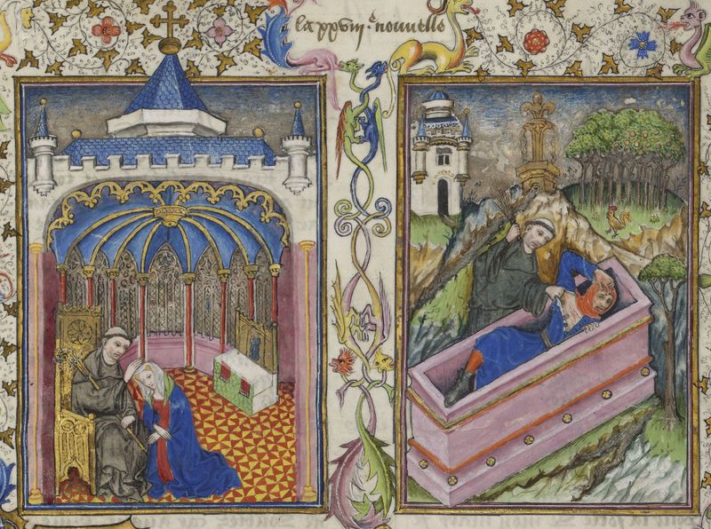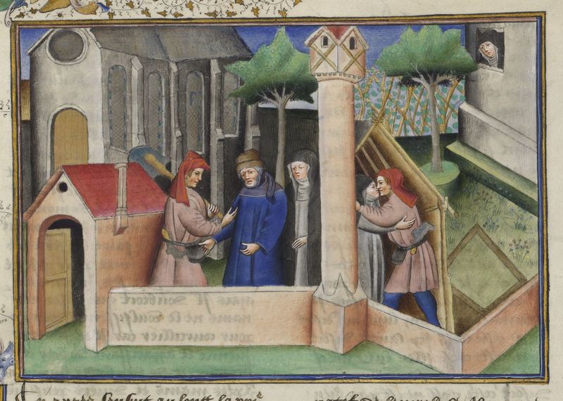 Parigi, Bibliothèque de l'Arsenal, 5070, f. 128r. Il copista del manoscritto è Guillebert de Mets. L'abate consegna alla moglie di Ferondo un anello durante la confessione; l'abate…
