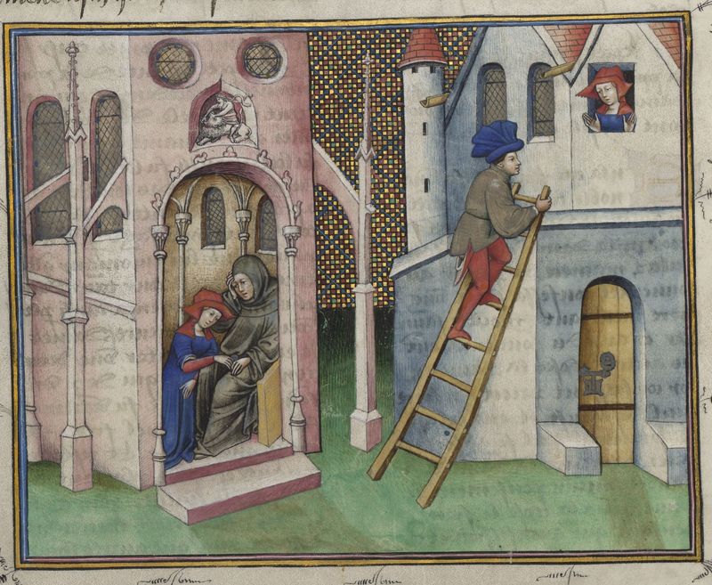 Parigi, Bibliothèque de l'Arsenal, 5070, f. 120r. Il copista del manoscritto è Guillebert de Mets. Tedaldo, travestito da pellegrino, spinge monna Ermellina a confessarsi; durante …
