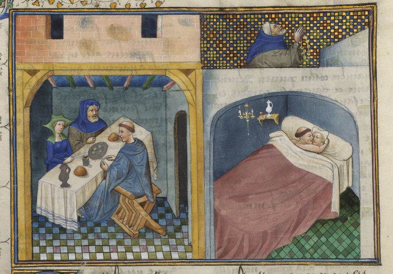 Maestro di Guillebert de Mets (1430-1450), Don Felice siede alla tavola di frate Puccio; don Felice giace con la moglie di Puccio