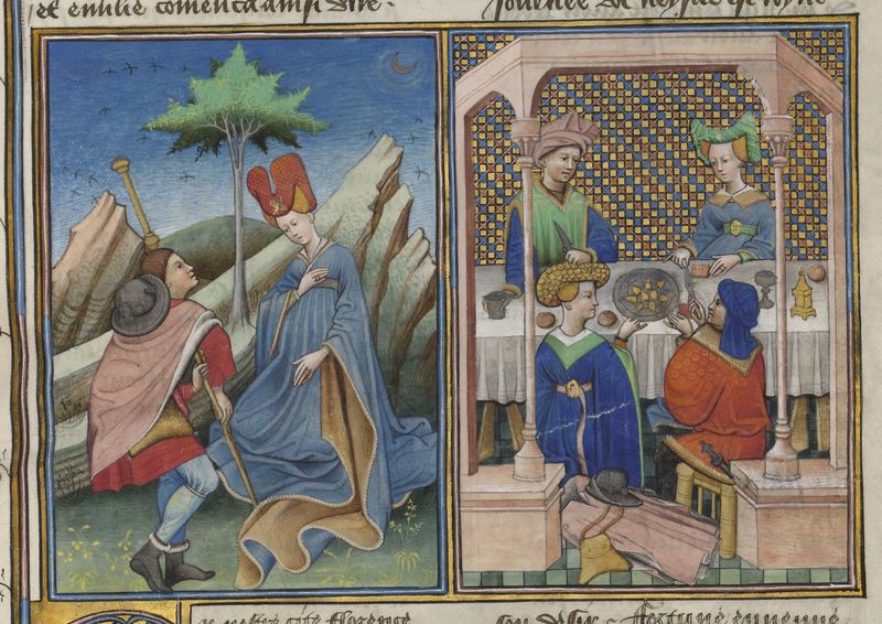 Parigi, Bibliothèque de l'Arsenal, 5070, f. 116r. Il copista del manoscritto è Guillebert de Mets. Due coppie di nobili napoletani, tra cui Ricciardo Minutolo e Catella, si incontr…