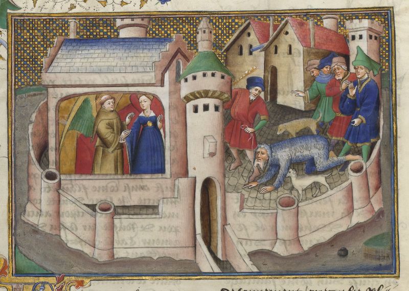 Parigi, Bibliothèque de l'Arsenal, 5070, f. 111v. Il copista del manoscritto è Guillebert de Mets. Francesco Vergellesi concede a Zima di parlare con sua moglie ottenendone in camb…