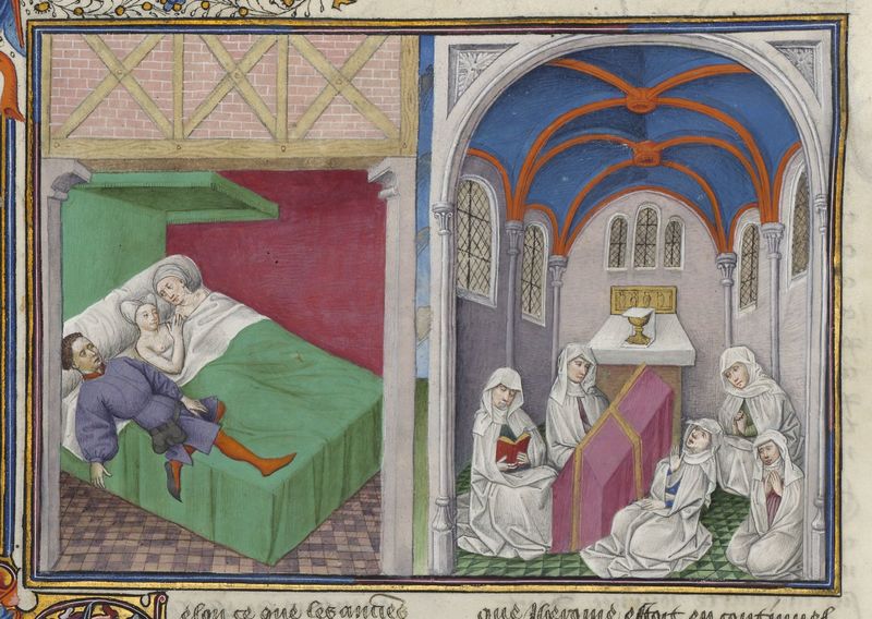 Parigi, Bibliothèque de l'Arsenal, 5070, f. 137v. Il copista del manoscritto è Guillebert de Mets. Alibech giace con l'eremita Rustico; la fanciulla si unisce in matrimonio con Nee…