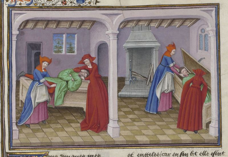 Parigi, Bibliothèque de l'Arsenal, 5070, f. 164v. Il copista del manoscritto è Guillebert de Mets. Gabriotto muore tra le braccia di Andreuola; Andreuola e la fantesca, trasportand…