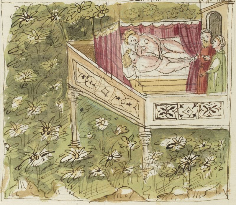 Parigi, Bibliothèque Nationale de France, It. 63, f. 150r. Il copista del manoscritto, datato 10 ottobre 1427, è Ludovico di Salvestro Ceffini. Nel giardino Gabriotto muore tra le …