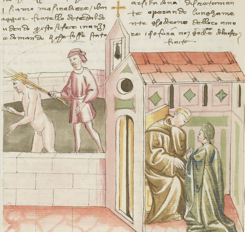 Miniatore fiorentino (1427-1430), La moglie di Ferondo si confessa con l'abate; l'abate punisce Ferondo