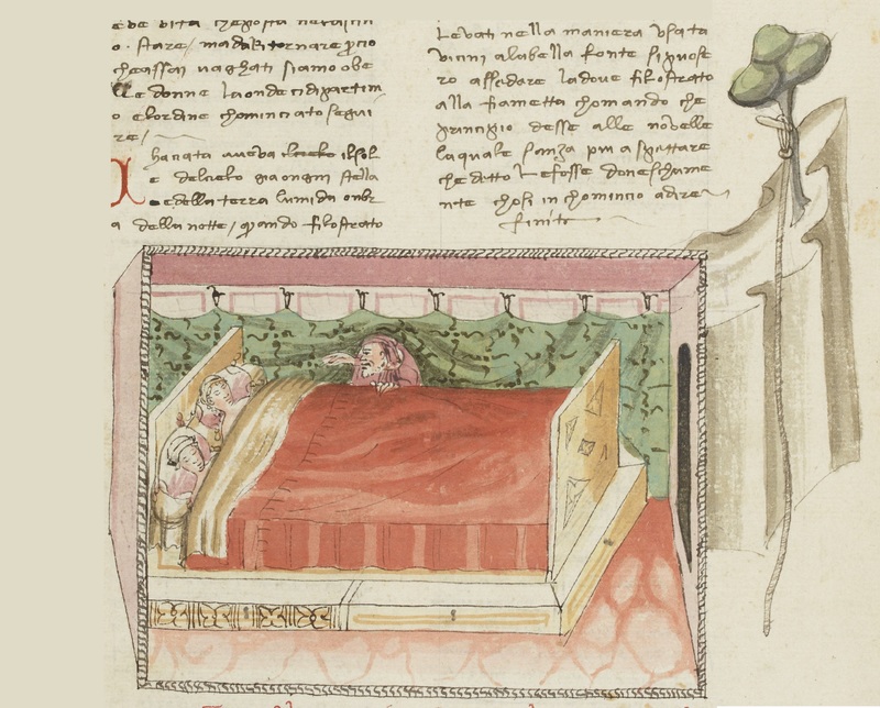 Parigi, Bibliothèque Nationale de France, It. 63, f. 175v. Il copista del manoscritto, datato 10 ottobre 1427, è Ludovico di Salvestro Ceffini. Lizio da Valbona e sua moglie scopro…