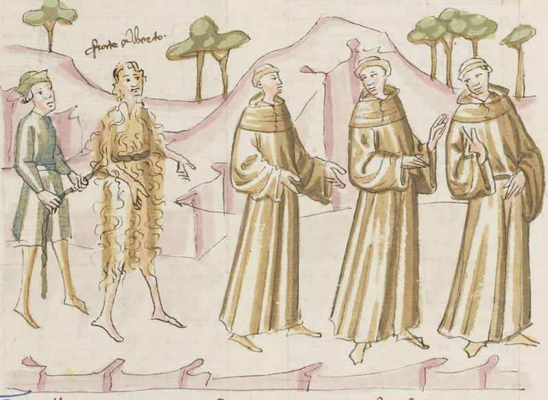 Parigi, Bibliothèque Nationale de France, It. 63, f. 138r. Il copista del manoscritto, datato 10 ottobre 1427, è Ludovico di Salvestro Ceffini. Frate Alberto, vestito da uomo selva…