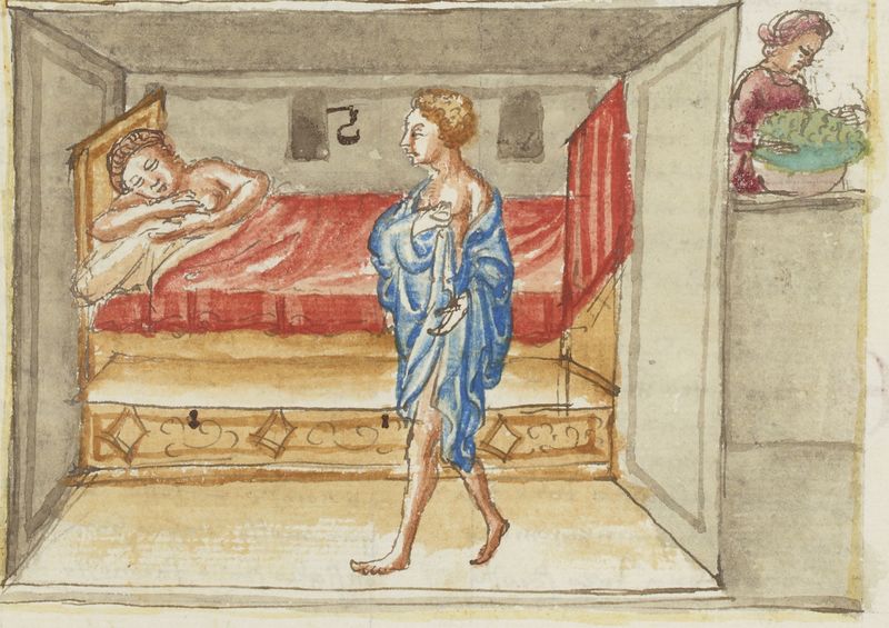Parigi, Bibliothèque Nationale de France, It. 63, f. 165r. Il copista del manoscritto, datato 10 ottobre 1427, è Ludovico di Salvestro Ceffini. Cimone osserva Efigenia addormentata…