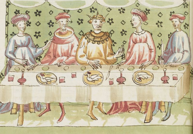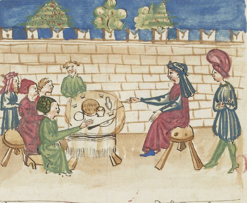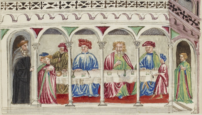 Parigi, Bibliothèque Nationale de France, It. 63, f. 30v. Il copista del manoscritto, datato 10 ottobre 1427, è Ludovico di Salvestro Ceffini. Alberto da Bologna conversa a tavola …