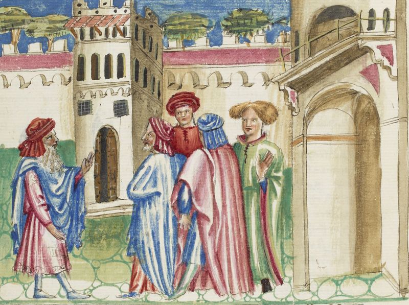 Parigi, Bibliothèque Nationale de France, It. 63, f. 106r. Il copista del manoscritto, datato 10 ottobre 1427, è Ludovico di Salvestro Ceffini. Ricciardo conversa con Catella nel g…