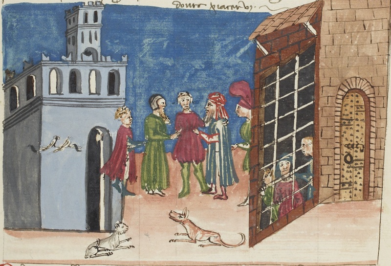 Parigi, Bibliothèque Nationale de France, It. 63, f. 34r. Il copista del manoscritto, datato 10 ottobre 1427, è Ludovico di Salvestro Ceffini. Martellino, fingendosi paralitico, so…