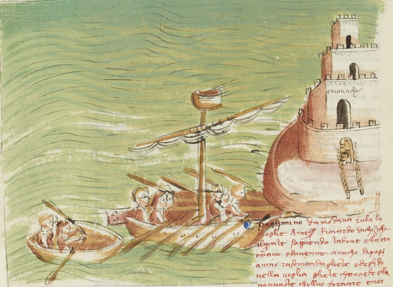 Parigi, Bibliothèque Nationale de France, It. 63, f. 53r. Il copista del manoscritto, datato 10 ottobre 1427, è Ludovico di Salvestro Ceffini. Currado Malaspina attracca all'isola …