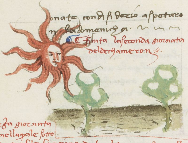 Parigi, Bibliothèque Nationale de France, It. 63, f. 89v. Il copista del manoscritto, datato 10 ottobre 1427, è Ludovico di Salvestro Ceffini. Il sole sorge sopra un paesaggio con …