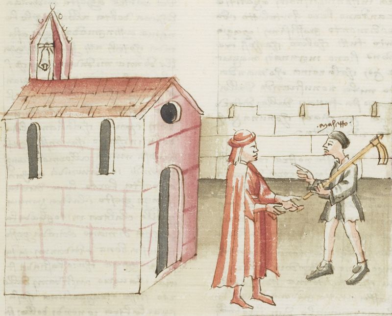 Parigi, Bibliothèque Nationale de France, It. 63, f. 24r. Il copista del manoscritto, datato 10 ottobre 1427, è Ludovico di Salvestro Ceffini. Un uomo discute con l'inquisitore, il…
