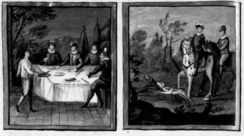Miniatore francese (XVII secolo), Chichibio serve la gru al tavolo dei nobili; Chichibio e Currado osservano le gru