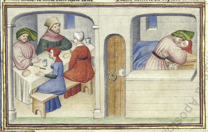 Maestro della Cité des Dames (1414-1419), Spinelloccio e Zeppa siedono a tavola con le loro mogli; Zeppa si bacia con la moglie di Spinelloccio
